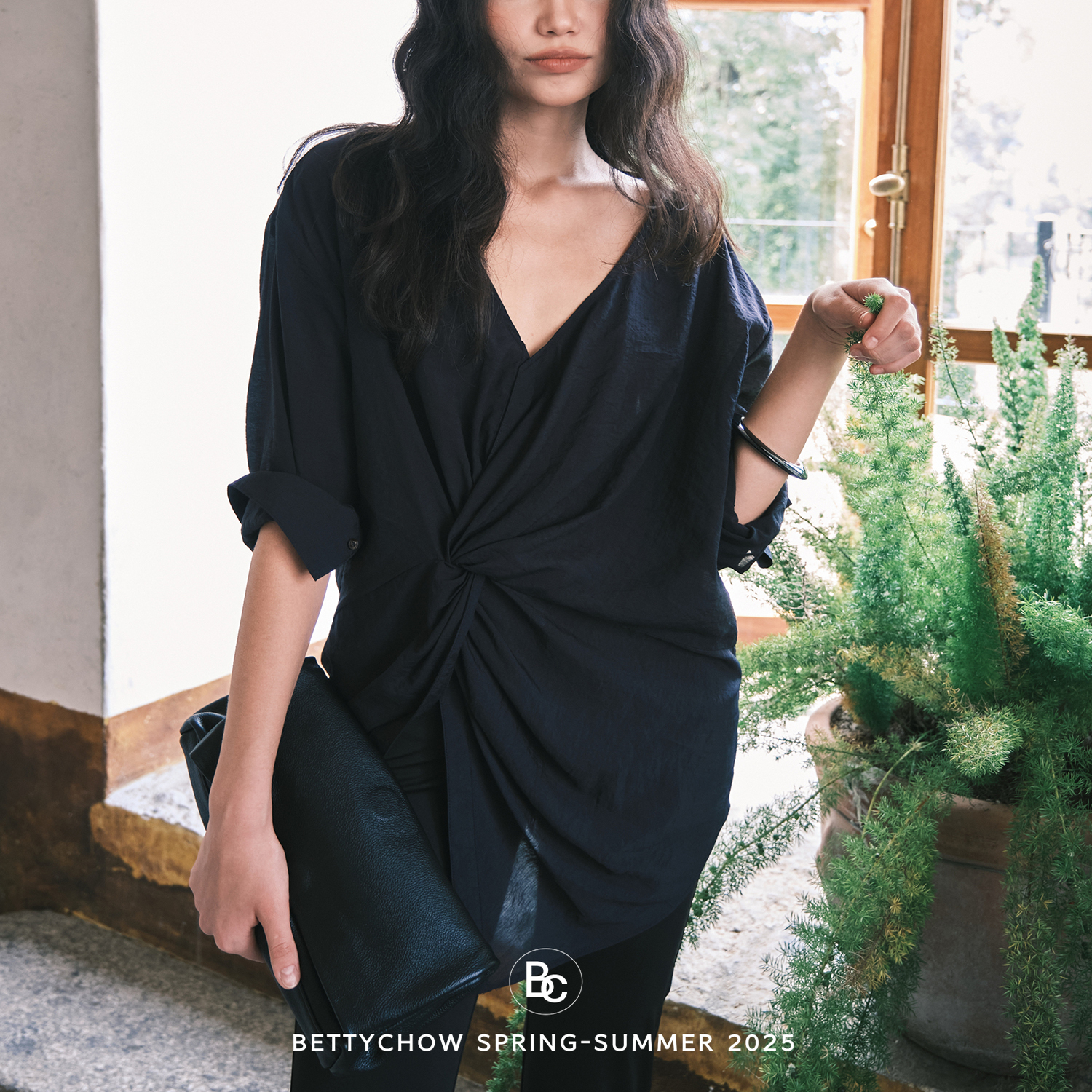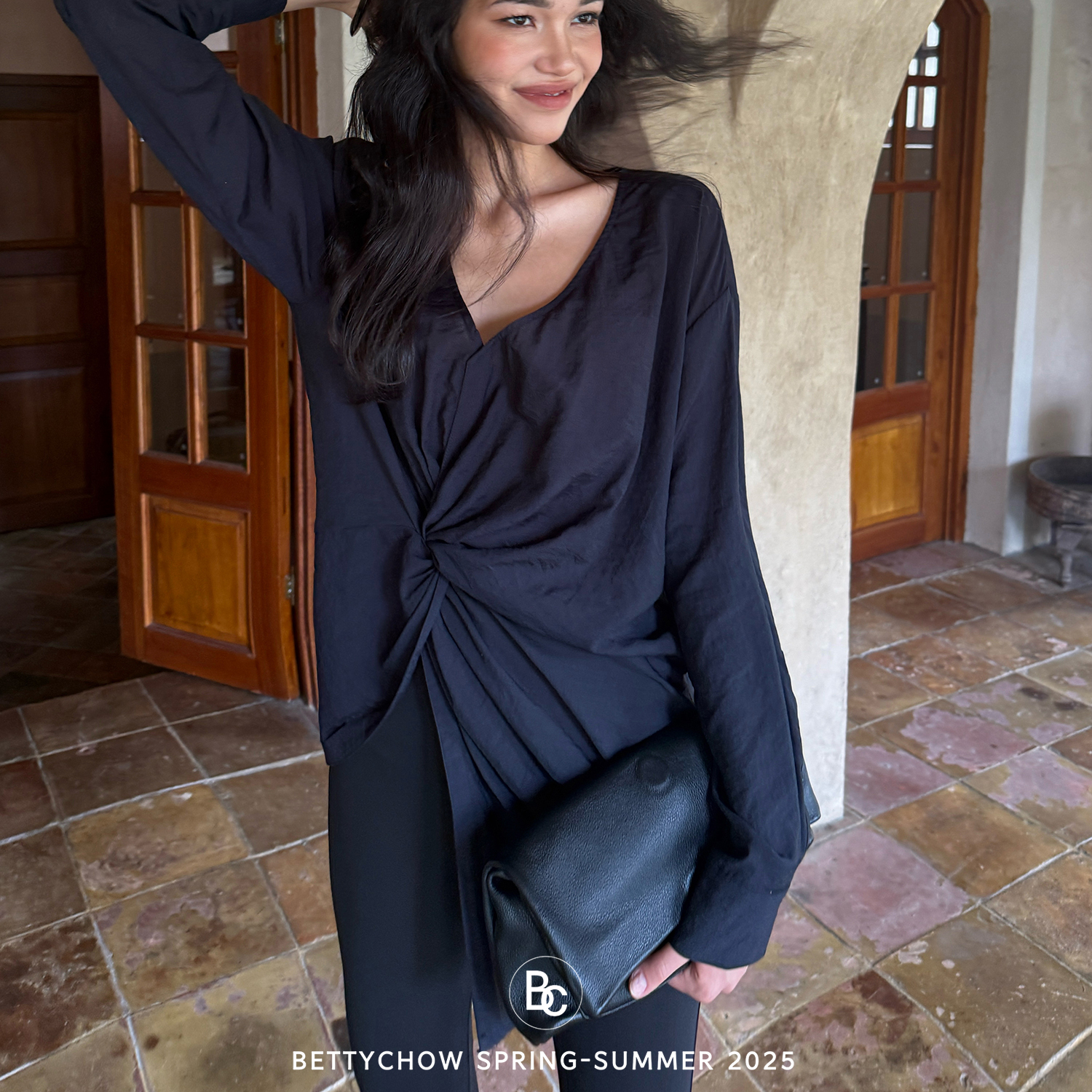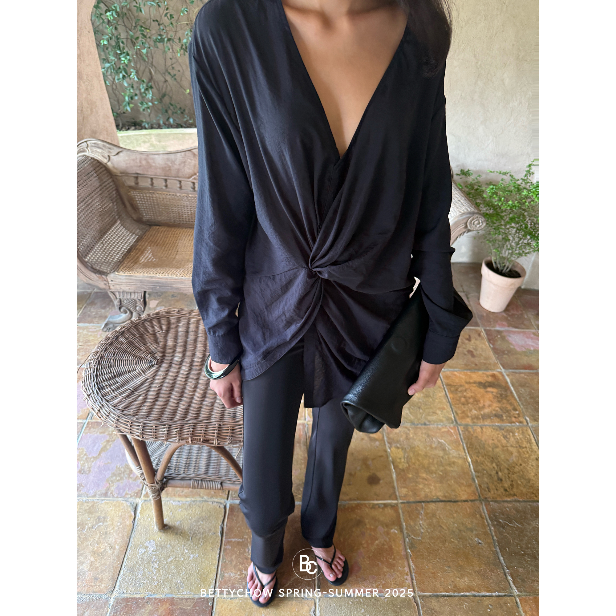 Bettychow 肌理软亚麻大V领扭结黑色衬衫老钱风个性宽松时髦上衣 - Betty Chow