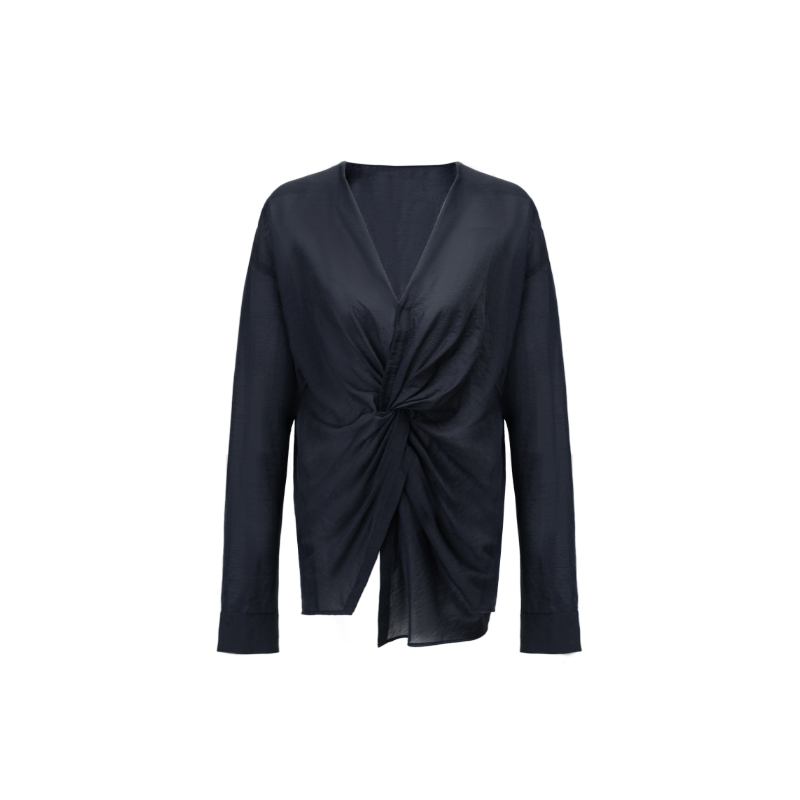 您的位置:淘折扣  >  女装  >  Bettychow 肌理软亚麻大V领扭结黑色衬衫老钱风个性宽松时髦上衣