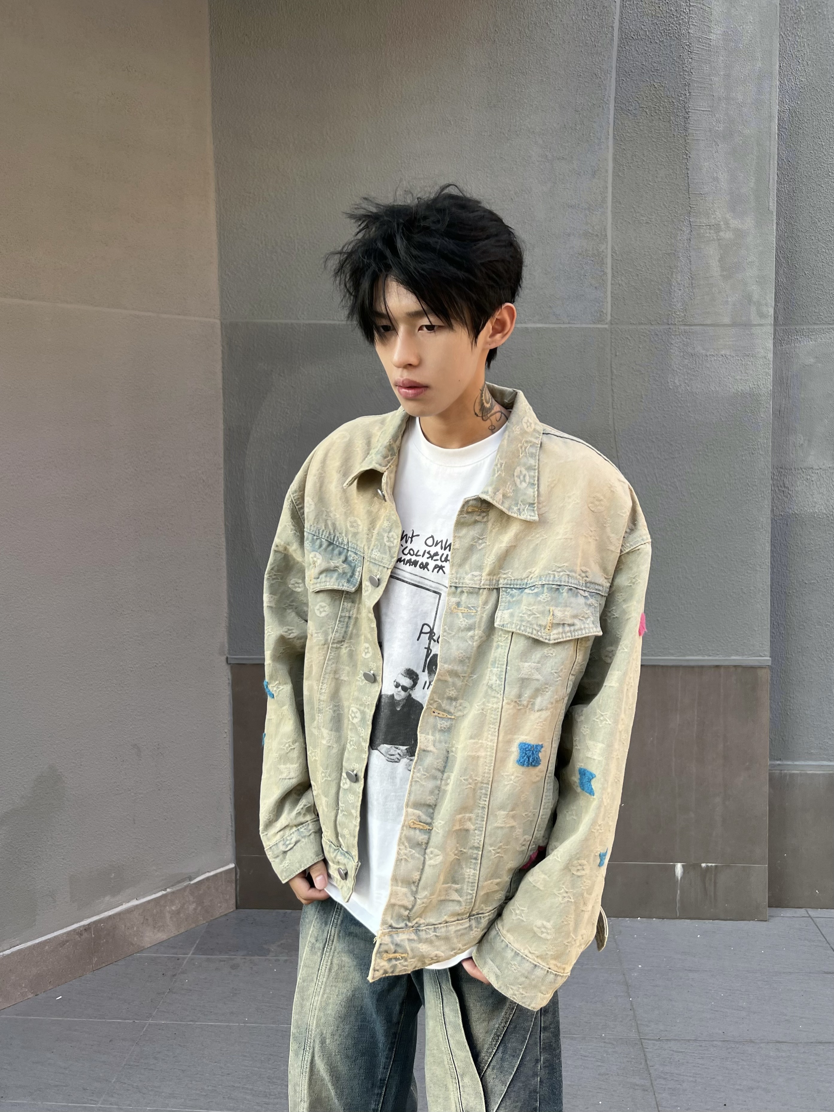 DHSS国潮美式高街做旧黄泥牛仔外套男女宽松宽松秋季潮牌复古夹克 - DHSS