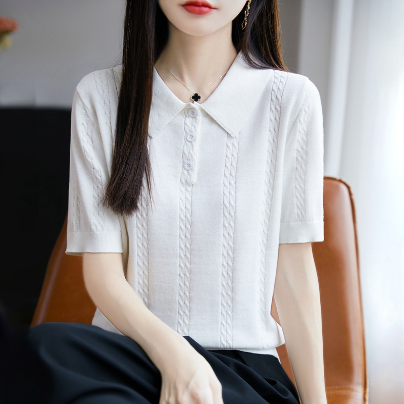 2025新款Polo领短袖针织衫女款蝴蝶结绞花胖MM体恤衫半袖灰黑白色 - 温暖如春羊绒制品店