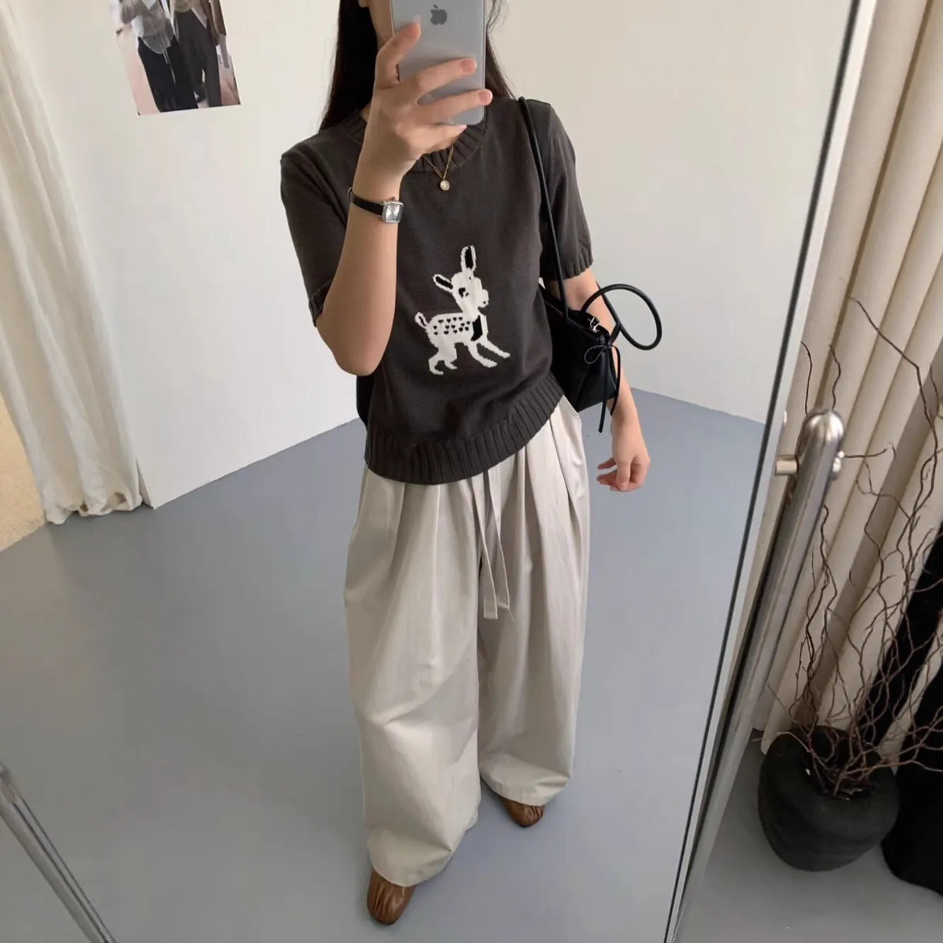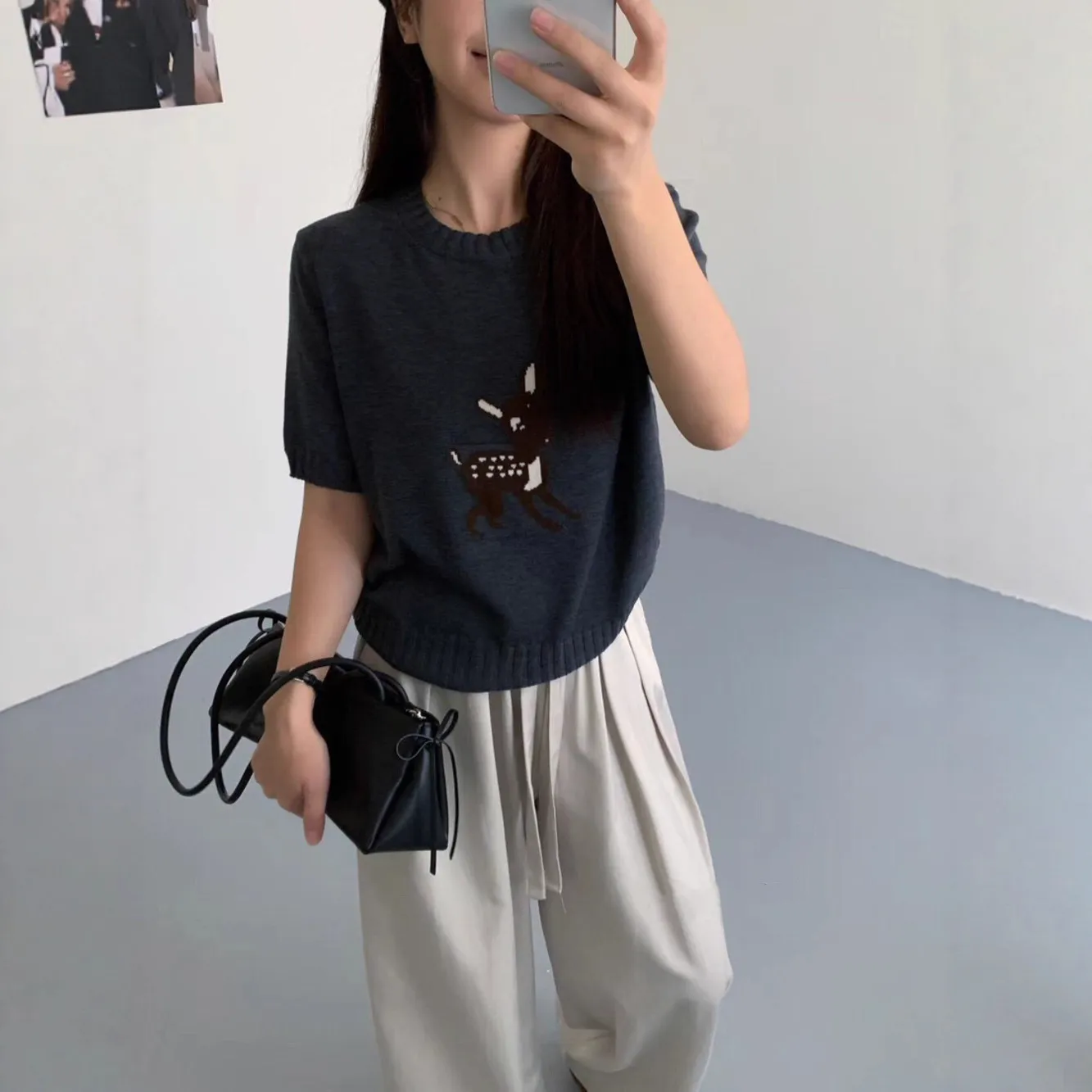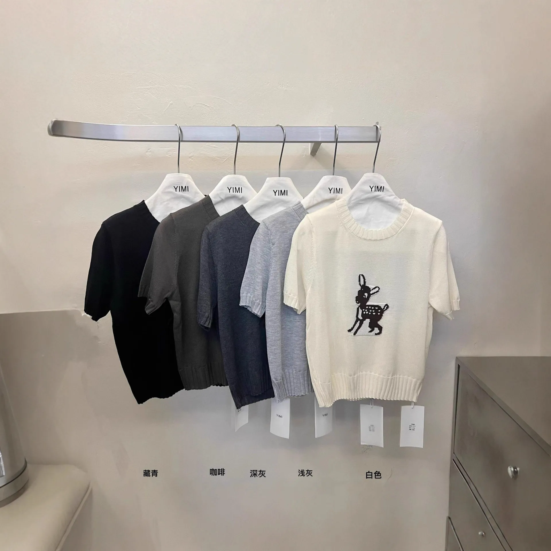春秋新款韩范百搭圆领短袖针织衫时尚小鹿提花短袖套头毛衣上衣女 - Me Too 女装