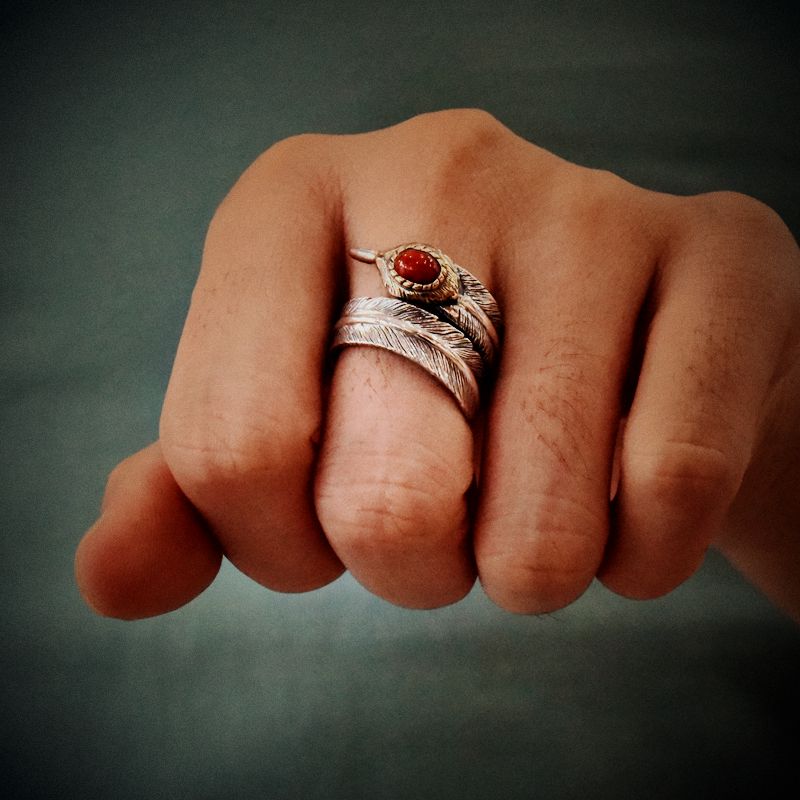 男女情侣复古款镶嵌南红玛瑙印第安羽毛开口泰银戒指925纯银指环 - 天堂制造